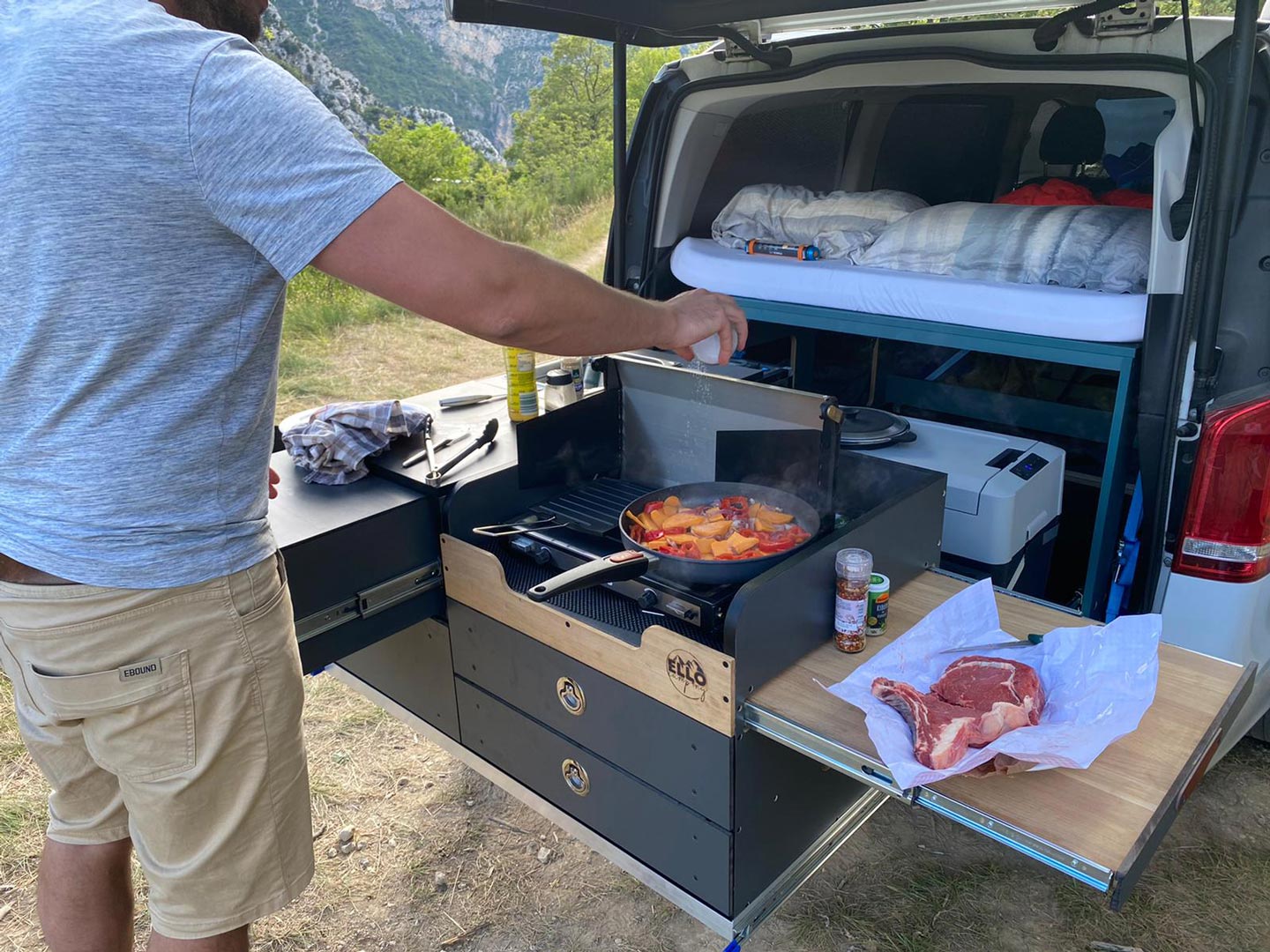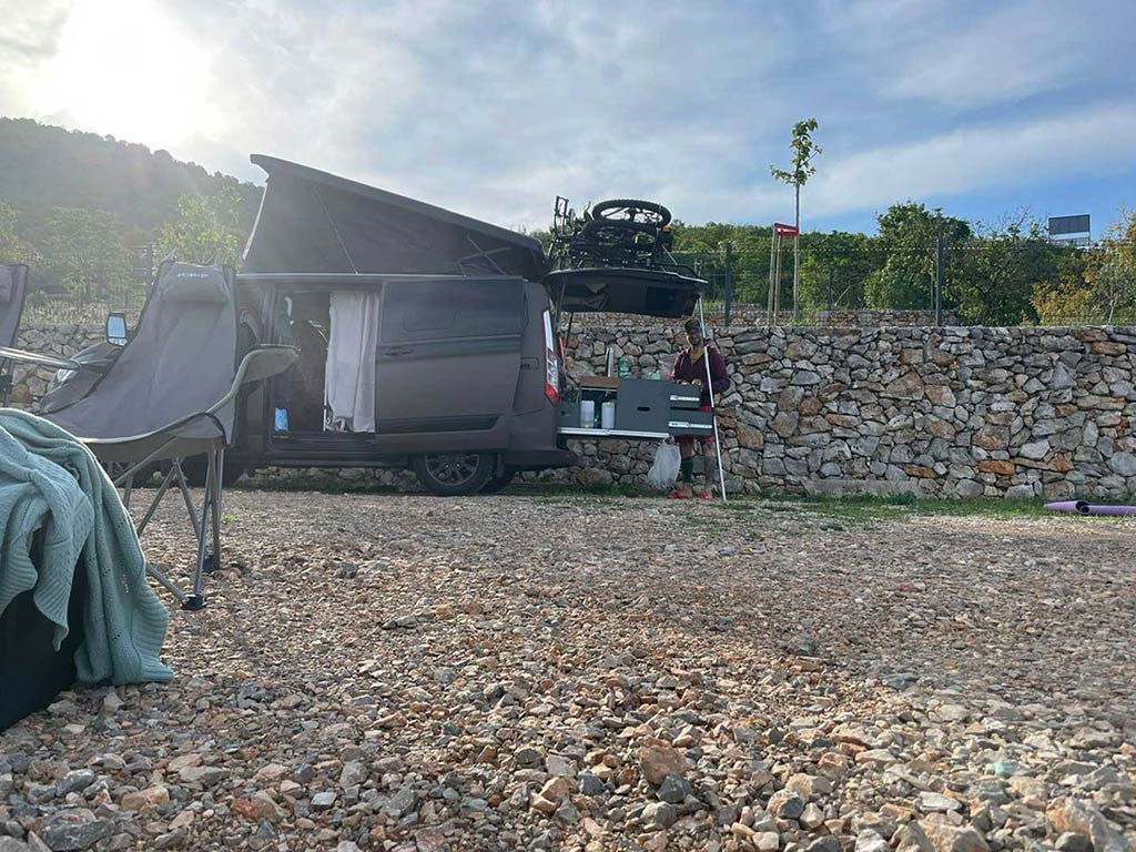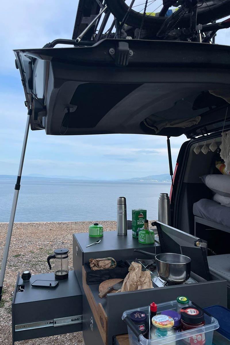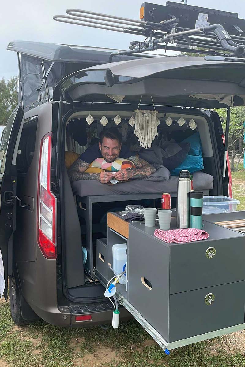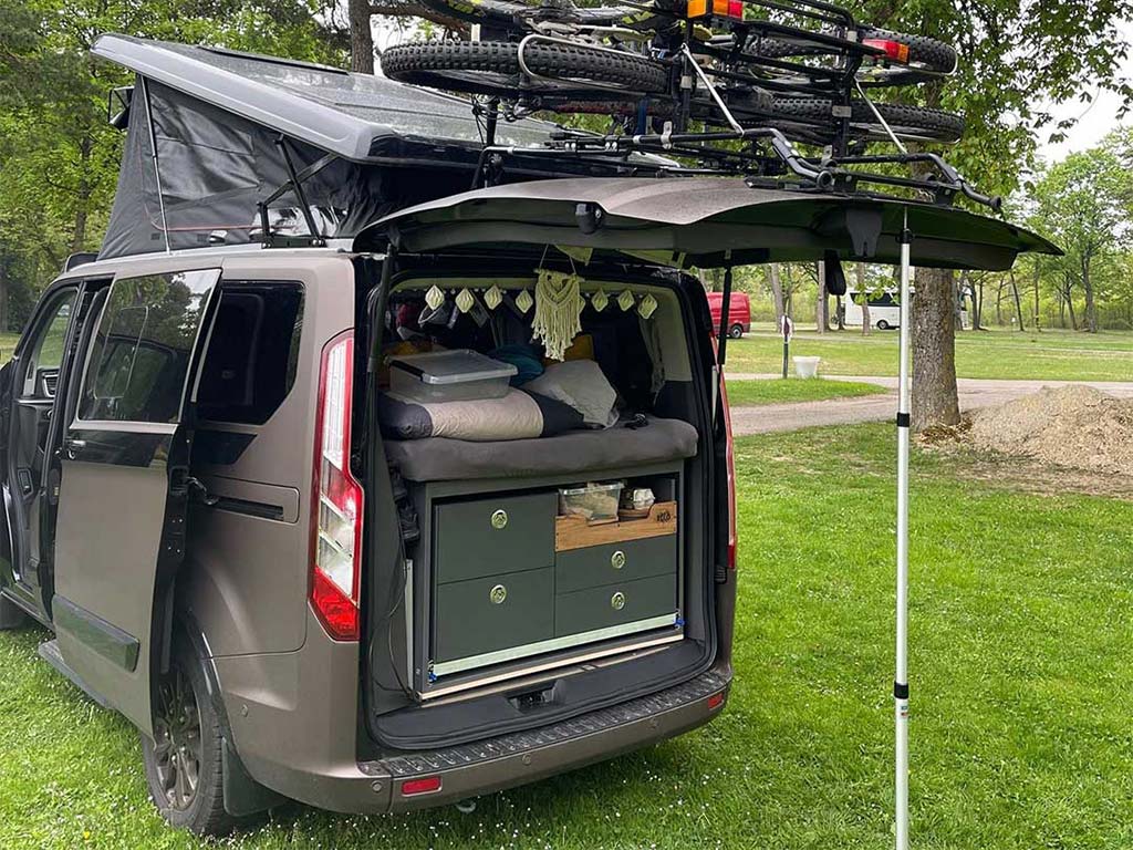 Als Paar unterwegs, kein Problem. In Karstens Ford Tourneo Custom, ausgestattet mit einem Ello Modulsystem, ist ausreichend Stauraum für eine lange Reise zu zweit vorhanden. Sogar das Stand-Up-Paddle-Board fand seinen Platz. Die beiden Mountainbikes werden auf dem Fahrradträger, eingehängt in die Heckklappe, außen transportiert. So steht einem Aktivurlaub nichts im Wege.