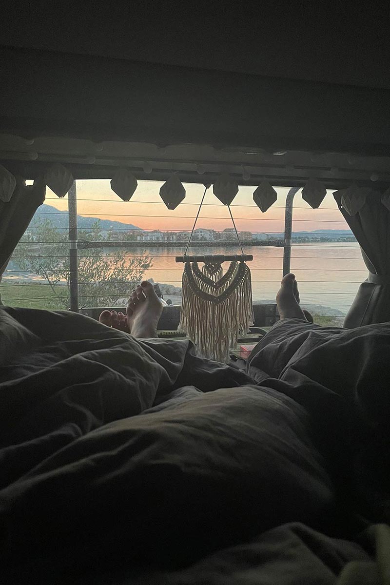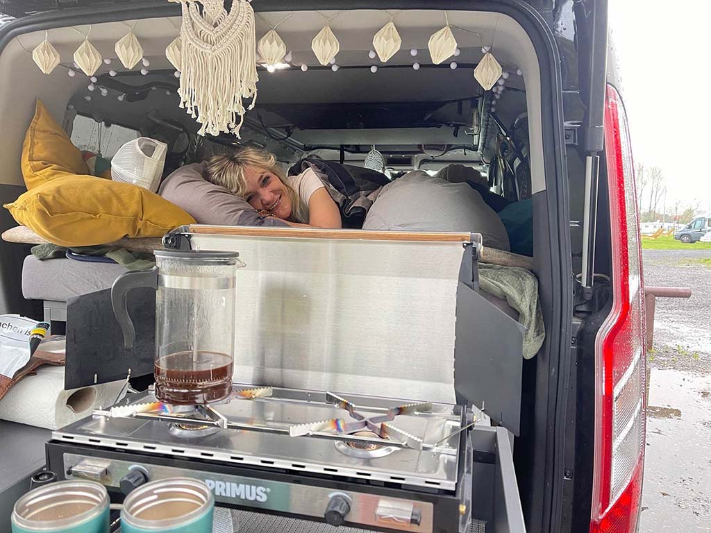 Mit gemütlichen Kissen und der Lichterkette wird vor allem am Abend eine richtig gemütliche Stimmung erzeugt, wie man beim Blick aus dem Heck sehen kann. Wir vom Team Ello Camping konnten unsere speziell auf den Ford Tourneo Custom angepasste, einseitige Bett-Verbreiterung beisteuern. Einfach links hinter der Klimasäule am Bett-Modul eingehängt, wird so die Bett-Oberfläche deutlich vergrößert. In Kombination mit unserer 140 cm breiten Faltmatratze lässt es sich auch zu zwei erholsam schlafen.
