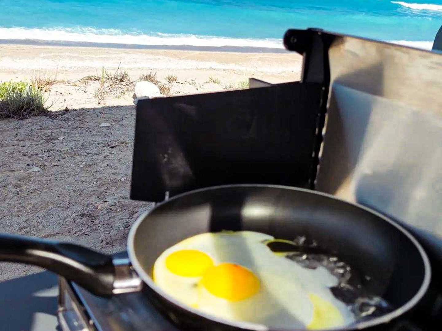 Dafür ist die die ionische Insel Lefkada bekannt. Die viertgrößte der ionischen Inseln liegt zwischen Korfu und Kefalonia. Durch eine Brücke mit dem griechischen Festland verbunden lässt sie sich mit dem Auto erreichen. Der Land Rover Defender unseres Kunden, ausgestattet mit einem Hartschalen-Dachzelt und natürlich unserer Ello Campingbox mit Seitenauszug im Heck, ist das perfekte Reisemobil auch für die etwas bergigen und steinigen Küstenstraßen. Erreicht man die atemberaubend schönen Strände Lefkadas, fällt einem direkt das türkisblaue Meer ins Auge. Dieses Panorama möchte man möglichst intensiv und lange genießen. Das passende, romantische Abend-Dinner direkt am Strand, wird direkt auf dem Primus Tupike, integriert in die windgeschützte Kocherstellfläche unserer Campingbox, zubereitet. Auch wenn es ein einfaches Gericht wie ein Spiegelei ist, diese unbezahlbare Aussicht fühlt sich an wie echter Luxus.